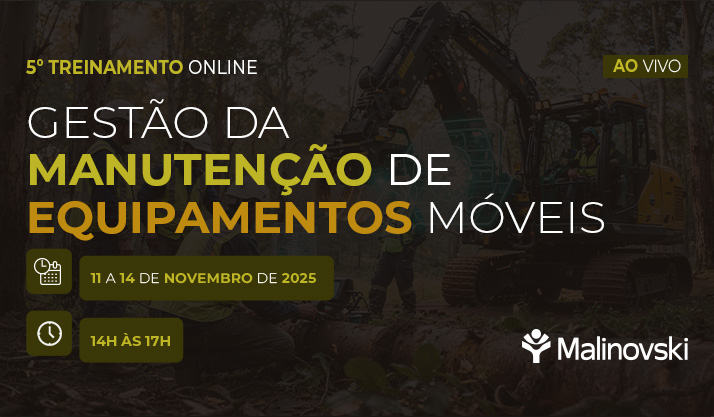 A Malinovski em parceria com os instrutores José Eduardo Paccola e Gilson dos Santos, oferecem a 5ª edição do treinamento online de Gestão da Manutenção de Equipamentos Móveis, nos dias 11 a 14 de novembro de 2025, das 14h às 17h, com carga horária de 12 horas e duração de 4 dias.